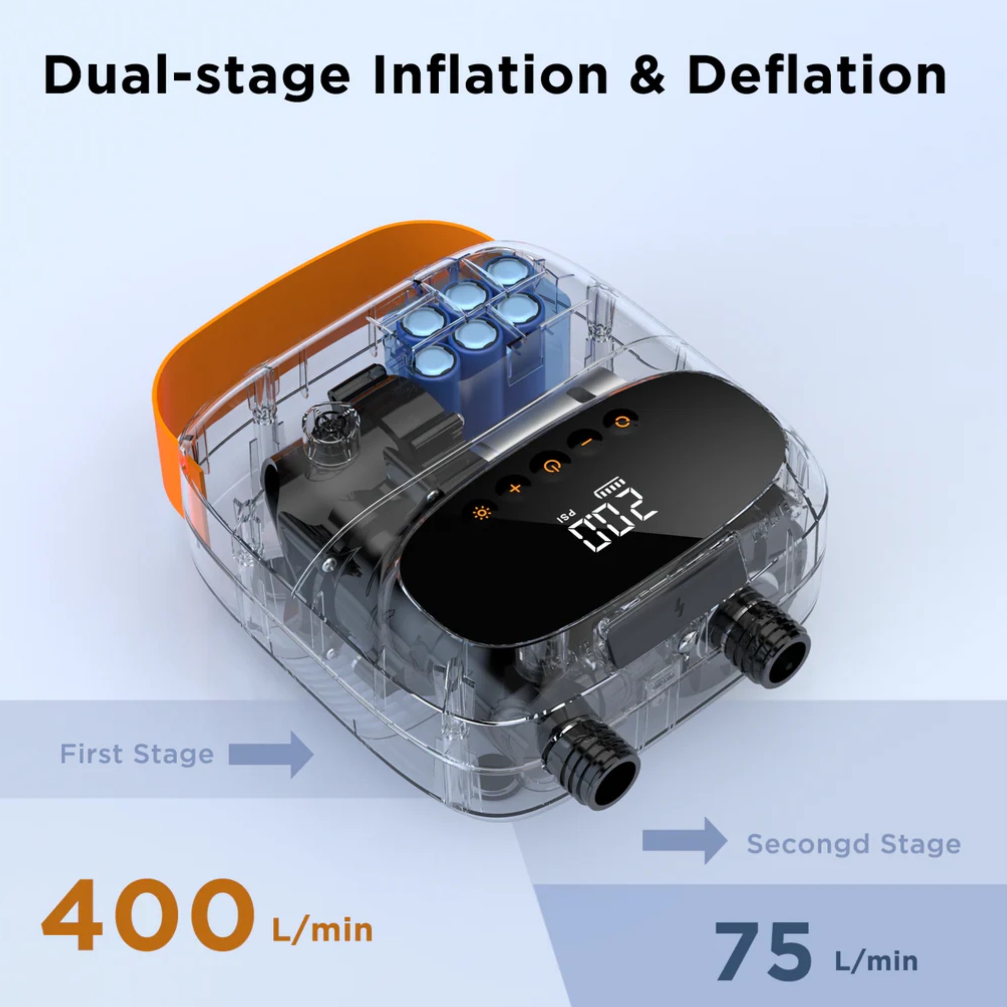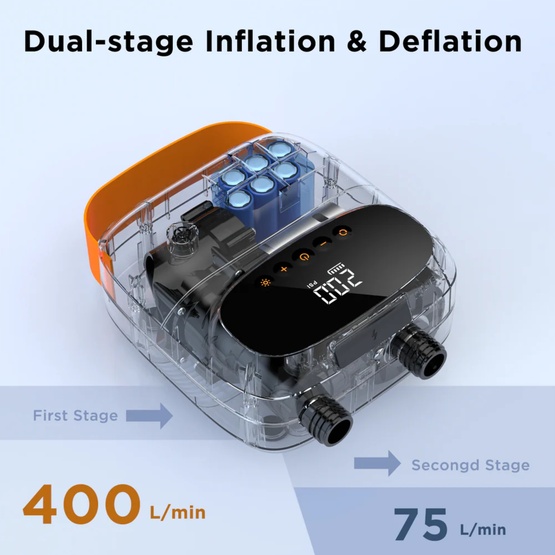 Urządzenie umożliwia precyzyjne ustawienie docelowego ciśnienia – wystarczy podłączyć wąż, ustawić wartość na wyświetlaczu LED i uruchomić pompowanie. Pompka automatycznie wyłącza się po osiągnięciu zadanej wartości, co pozwala w tym czasie spokojnie przygotować sprzęt. Dwa tryby pompowania (400 l/min i 85 l/min) oraz funkcja wypompowywania zapewniają wszechstronność w różnych zastosowaniach – od pompowania latawców kite, skrzydeł wingfoil, po deski SUP, pontony i akcesoria kempingowe.