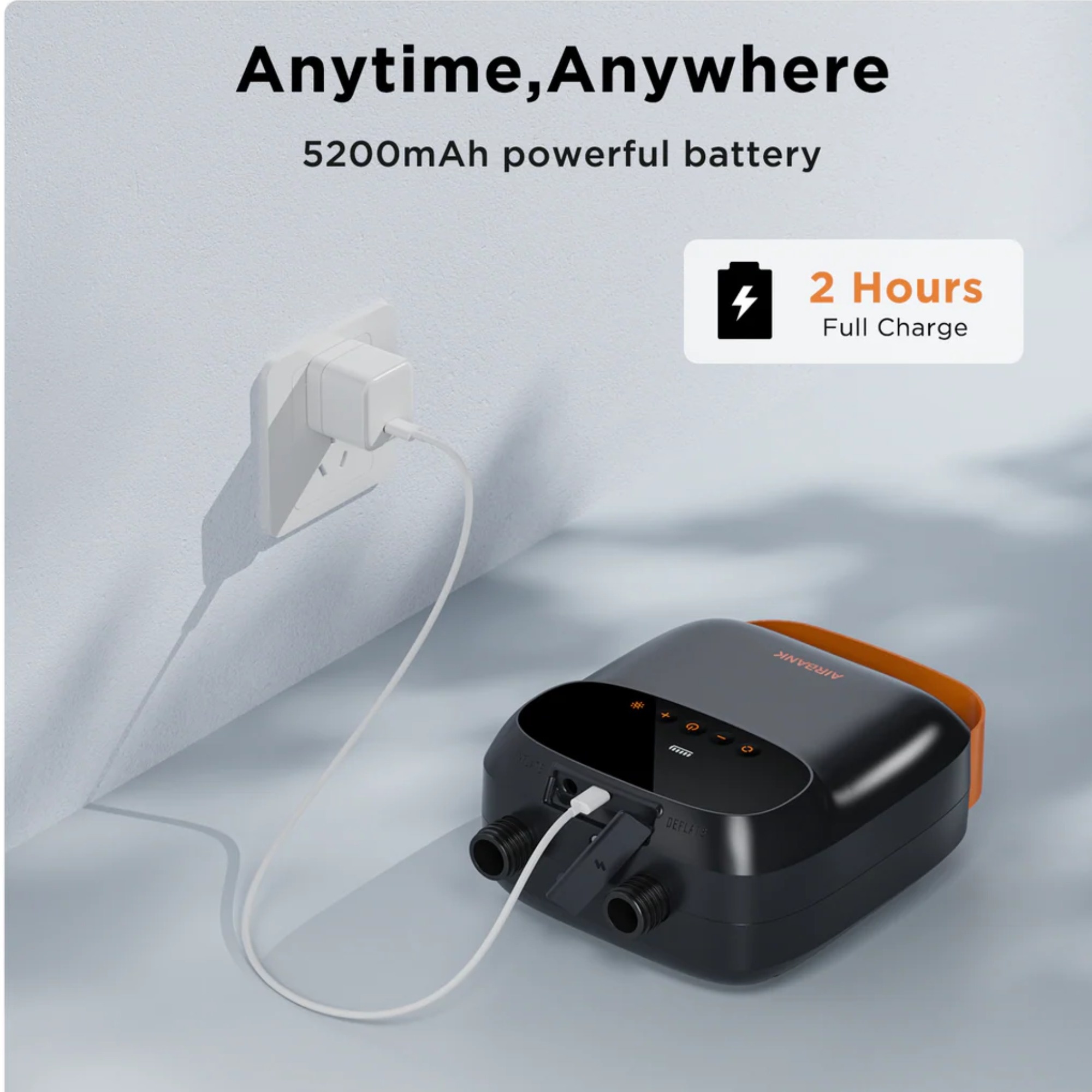 Puffer PRO wyposażony jest w pojemną baterię 5200 mAh, która pozwala na napompowanie ok. 3 desek SUP 10’5” na jednym ładowaniu. Ładowanie odbywa się przez port USB-C i trwa około 2 godziny. Dodatkowo pompka może pełnić funkcję power banku i latarki LED, dzięki czemu sprawdza się nie tylko na spocie, ale i podczas biwaków czy podróży.