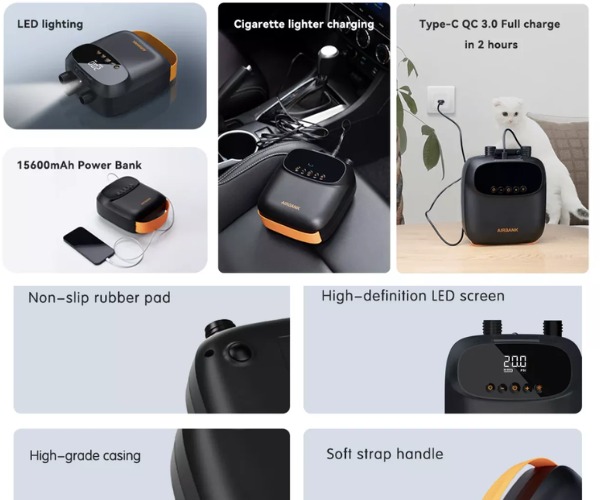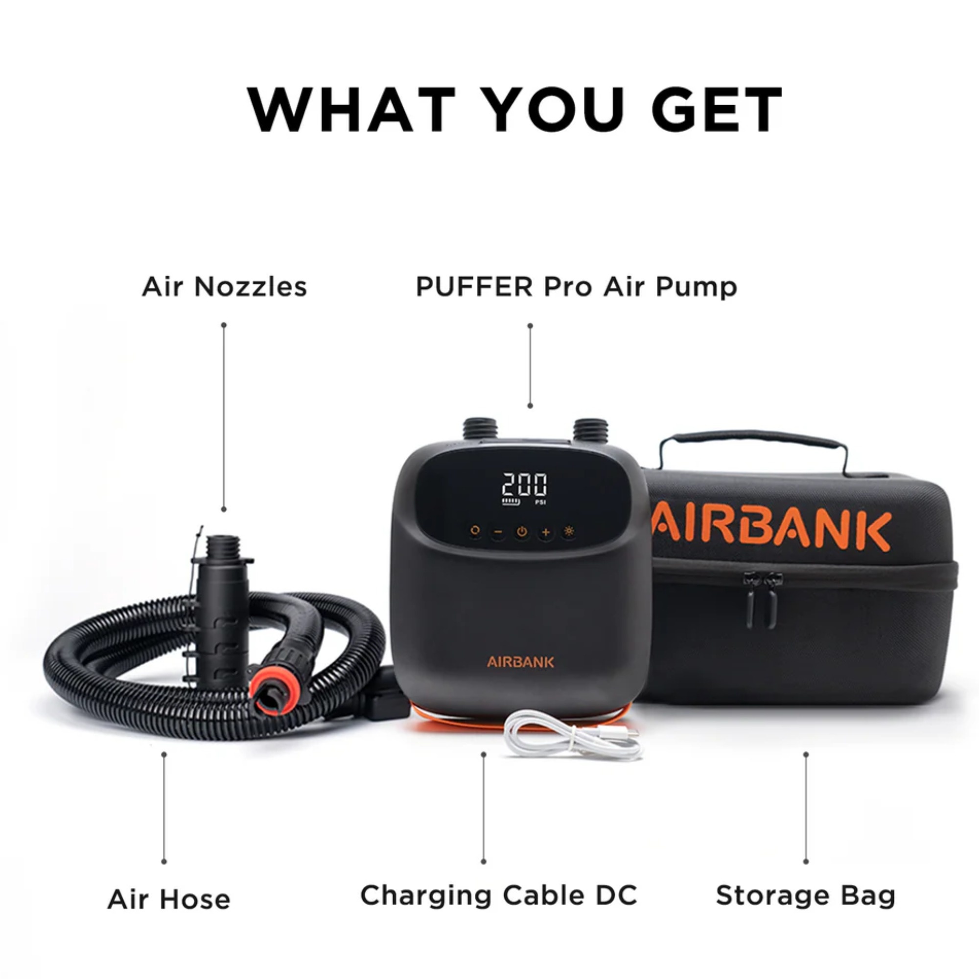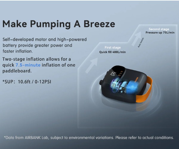 Elektryczna pompka SUP AIRBANK została wykonana z trwałych, wysokiej jakości materiałów. Wyposażono ją w czytelny wyświetlacz LED, praktyczny pasek do przenoszenia oraz gumowe pady stabilizujące urządzenie podczas pracy. Model AIRBANK Puffer PRO oferuje także funkcję latarki LED i powerbanku, a ładowanie odbywa się wygodnie przez port USB-C.
