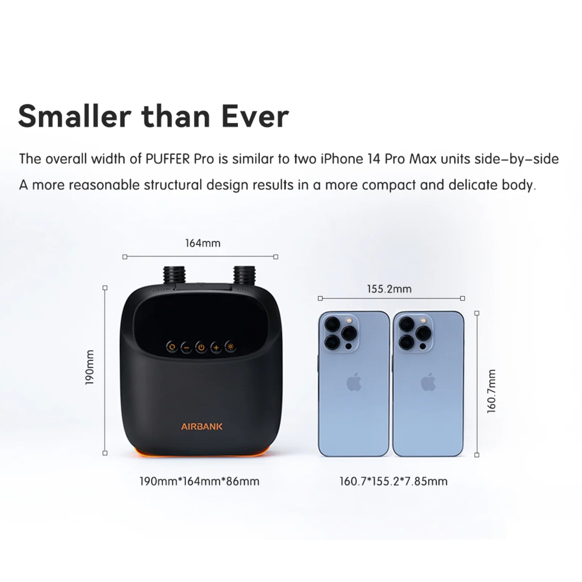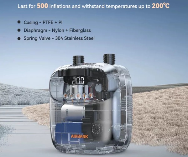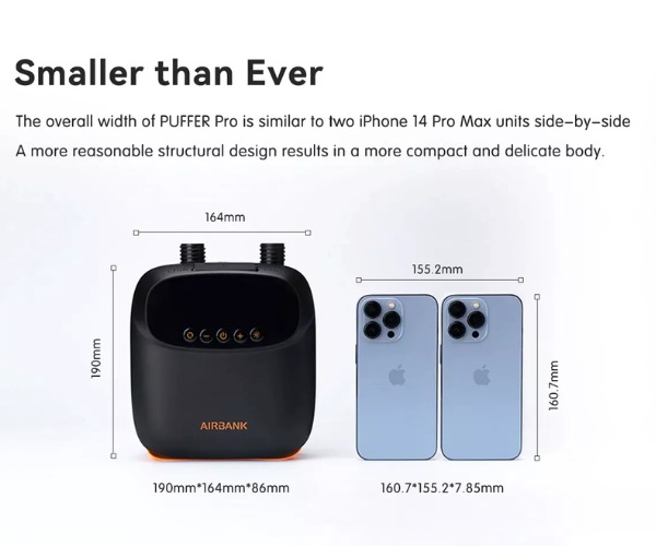 Pompka AIRBANK wyróżnia się kompaktową konstrukcją – jej wymiary to tylko 190 × 164 × 86 mm, dzięki czemu jest wielokrotnie mniejsza od typowej pompki kitesurfingowej.
