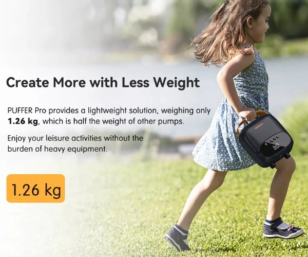 AIRBANK Puffer PRO to nowoczesna pompka elektryczna, która znacząco ułatwia przygotowanie do pływania. Niska waga (1,26 kg) i kompaktowe wymiary (190 × 164 × 86 mm) sprawiają, że bez problemu zmieścisz ją w bagażu, także podróżując samolotem – pojemność baterii mieści się w normach większości linii lotniczych.