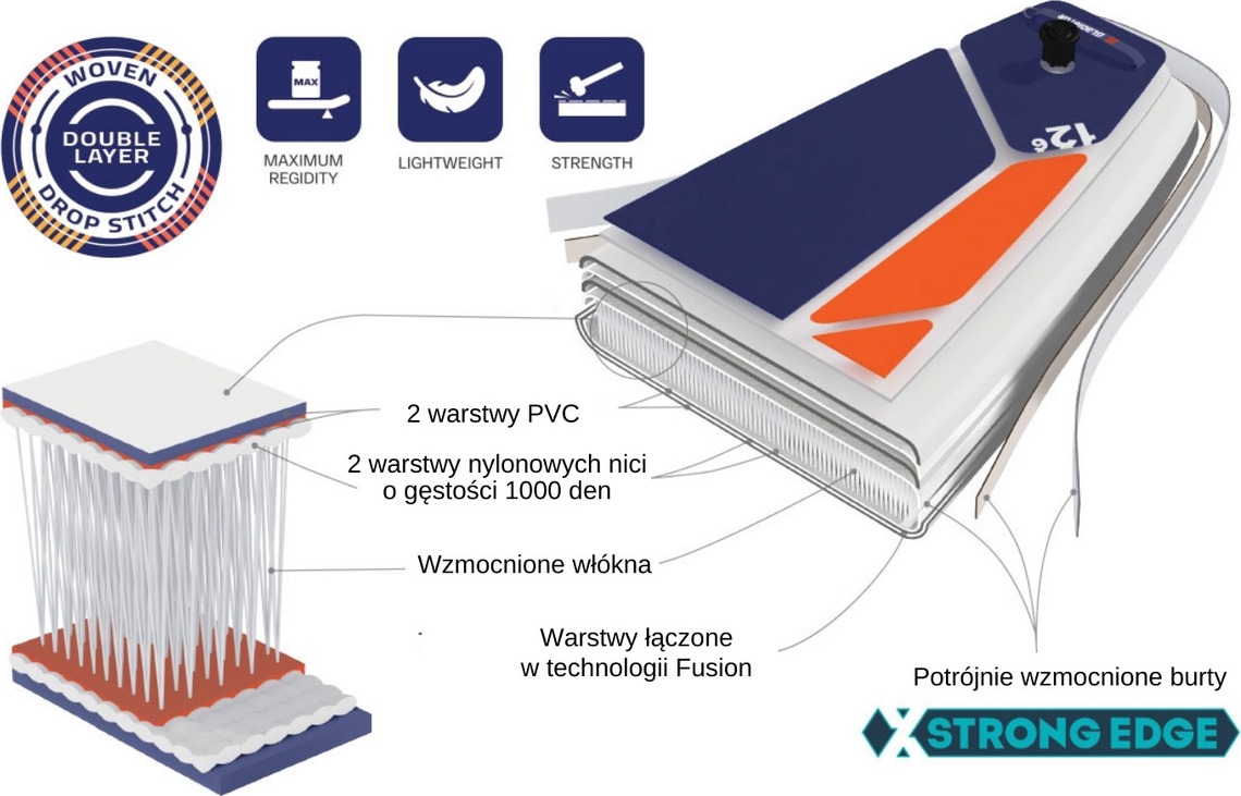 Zaawansowane technologie (m.in. Double Laminated Dropstich) zapewniają najwyższą trwałość. Ciesz się paddlingową przygodą przez wiele sezonów!