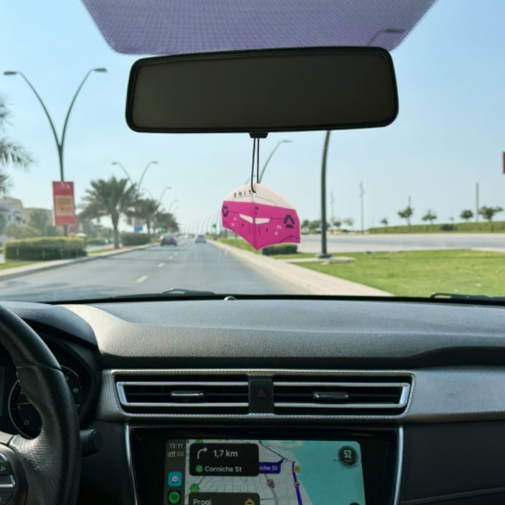 Grafika na zawieszce to wierne odwzorowanie designu Duotone Unit Pink. Jeśli pływasz na Unitach albo po prostu lubisz wyrazisty styl Duotone, ten detal od razu będzie „czytelny” w aucie czy vanie.