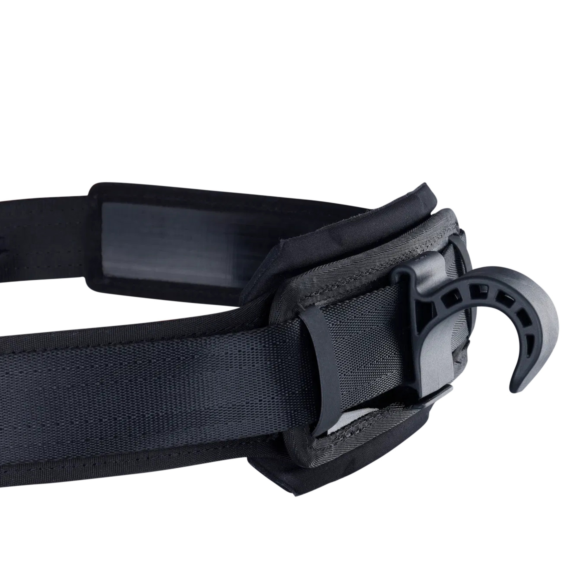 Rush ma zintegrowany spreader bar z hakiem do wingfoila. Curv Flaps tworzą płynne przejście między spreader barem a pasem i usztywniają boki, co pomaga ograniczyć skręcanie i przesuwanie się środka pod obciążeniem. W praktyce oznacza to stabilniejsze trzymanie i bardziej przewidywalne przenoszenie siły z wing’a na ciało.