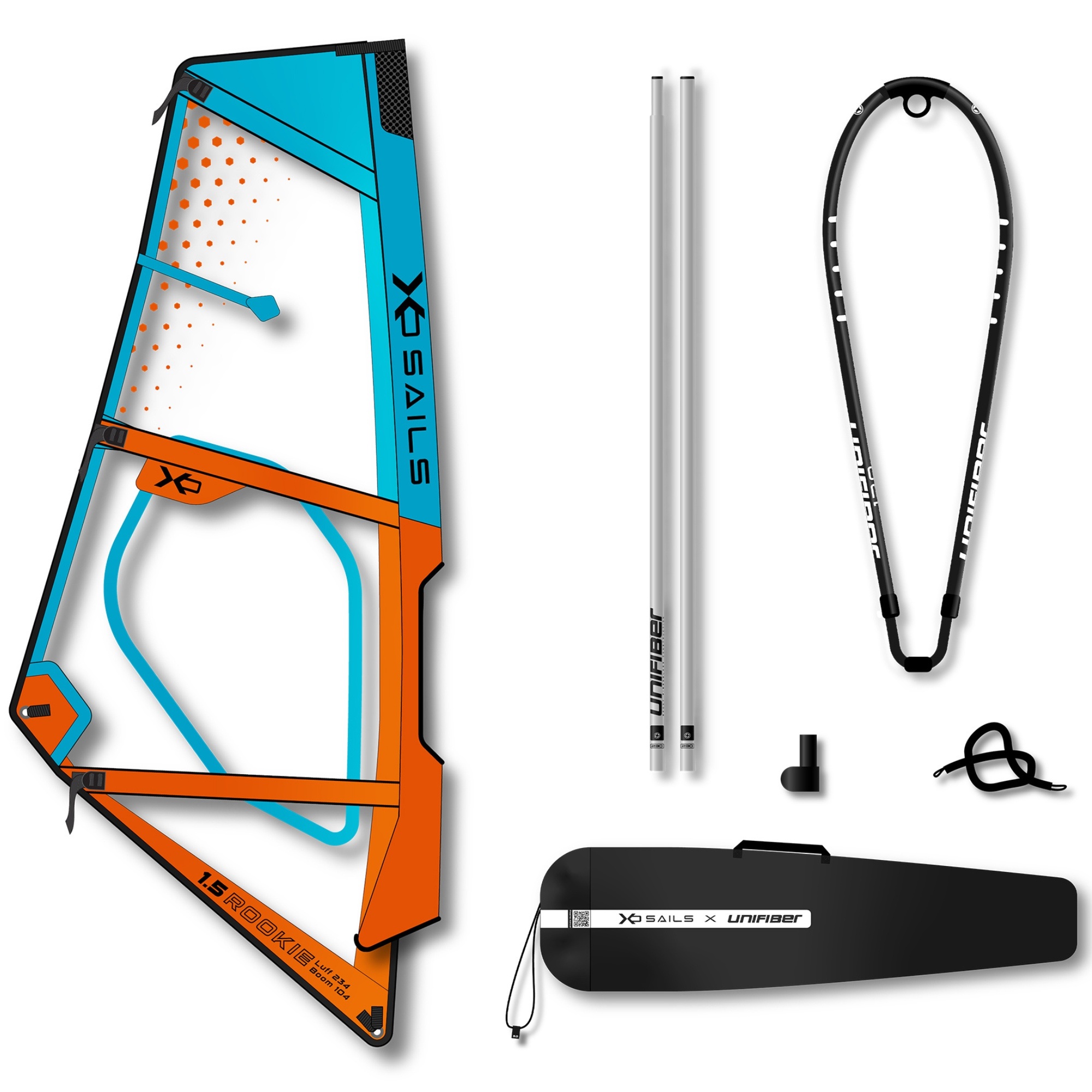 Hardware pack zawiera aluminiowy maszt, bom, podstawę masztu i fał startowy w torbie. System XO Sails x Unifiber został zaprojektowany tak, aby żagle w tym samym rozmiarze pasowały do tych samych elementów osprzętu. Ułatwia to organizację sprzętu i ewentualną wymianę pojedynczych części.