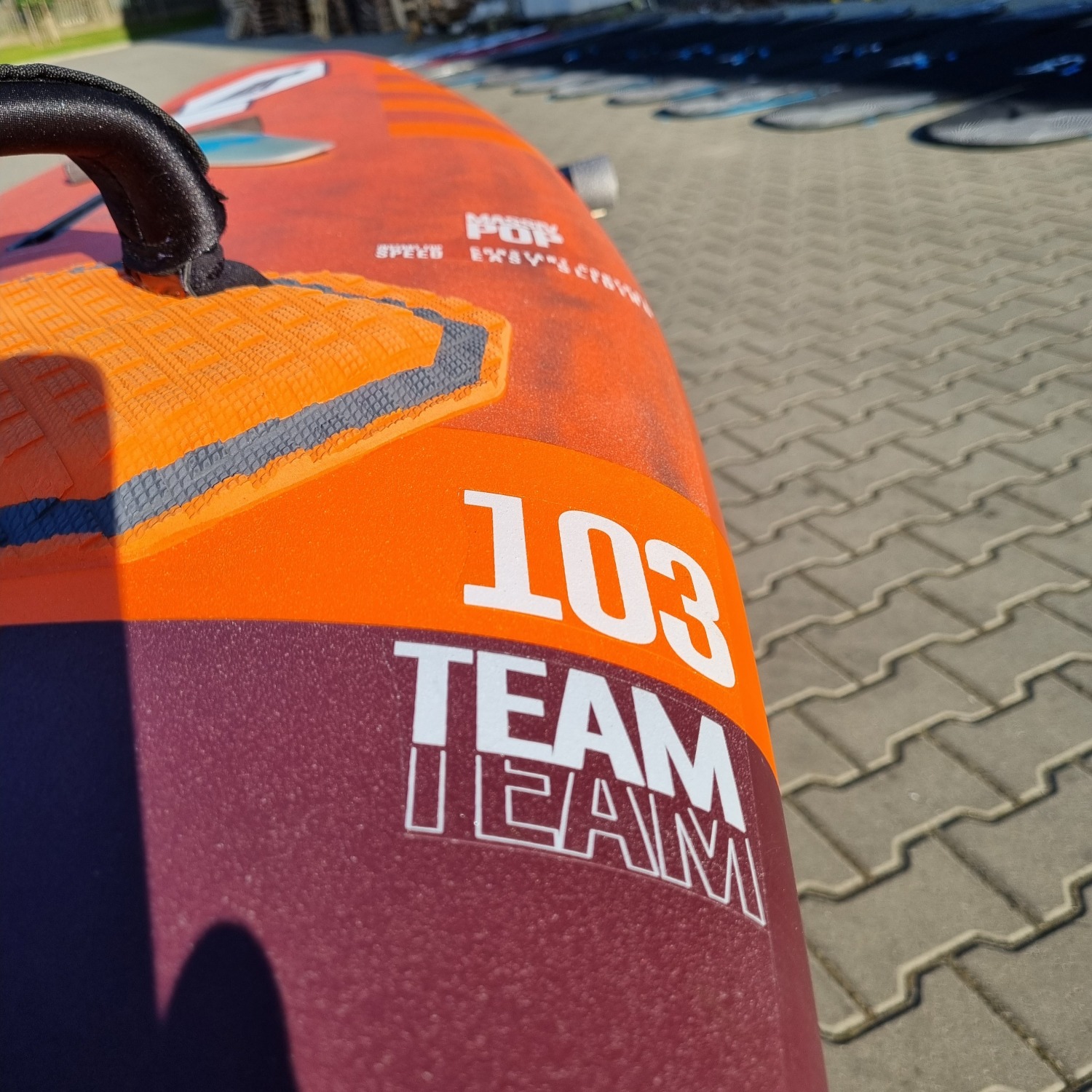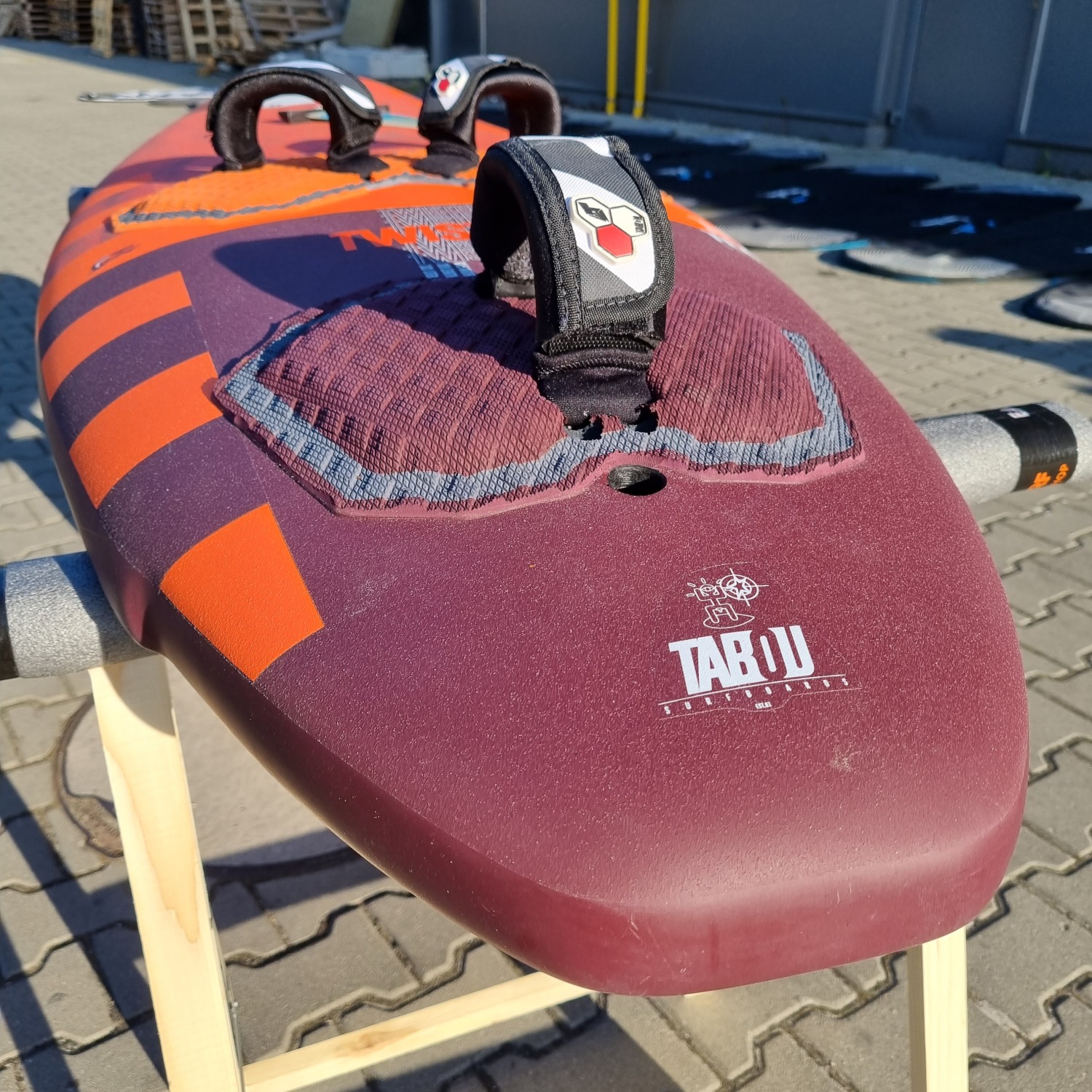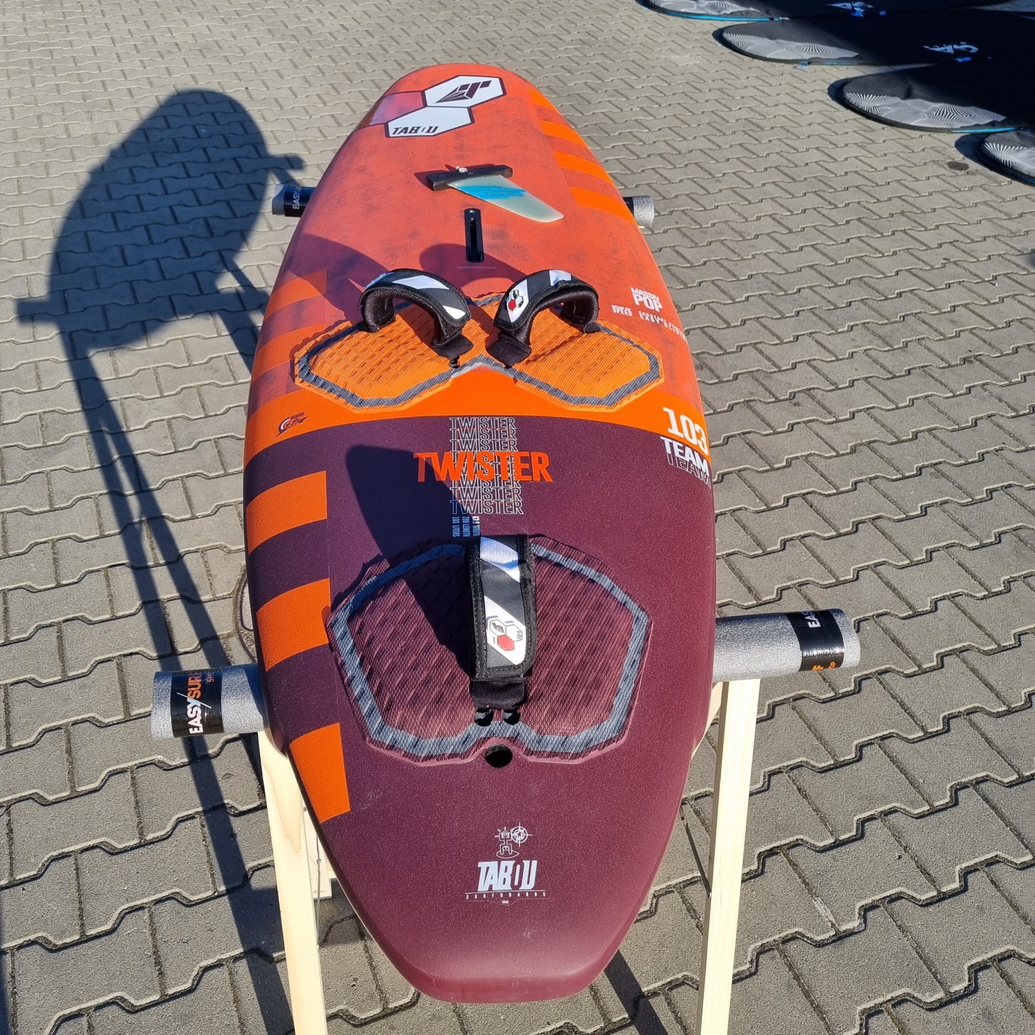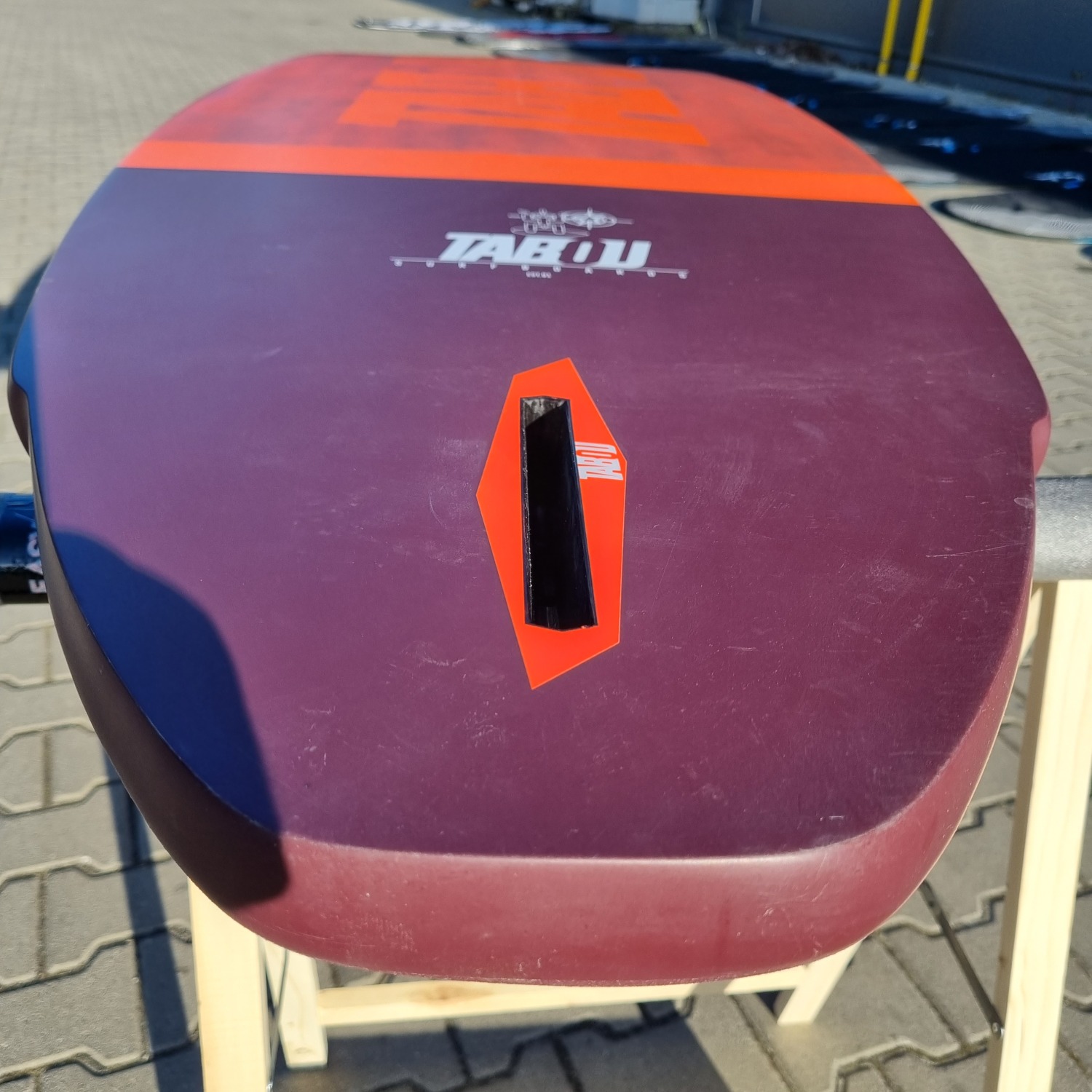Deska była użytkowana przez riderów EASY-surfshop w sezonie 2022. Była sporadycznie użytkowana na loklanych akwenach, przez co deska jest w niemal idealnym stanie. Jedynym mankamentem jest ślad po lekkim uderzeniu w przedniej części pokładu (ostatnie zdjęcie). Deska wyposażona jest w statecznik i komplet footstrapów.