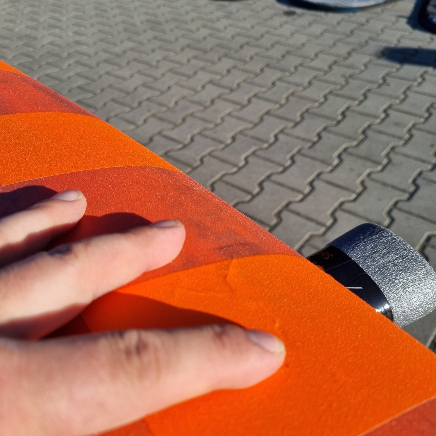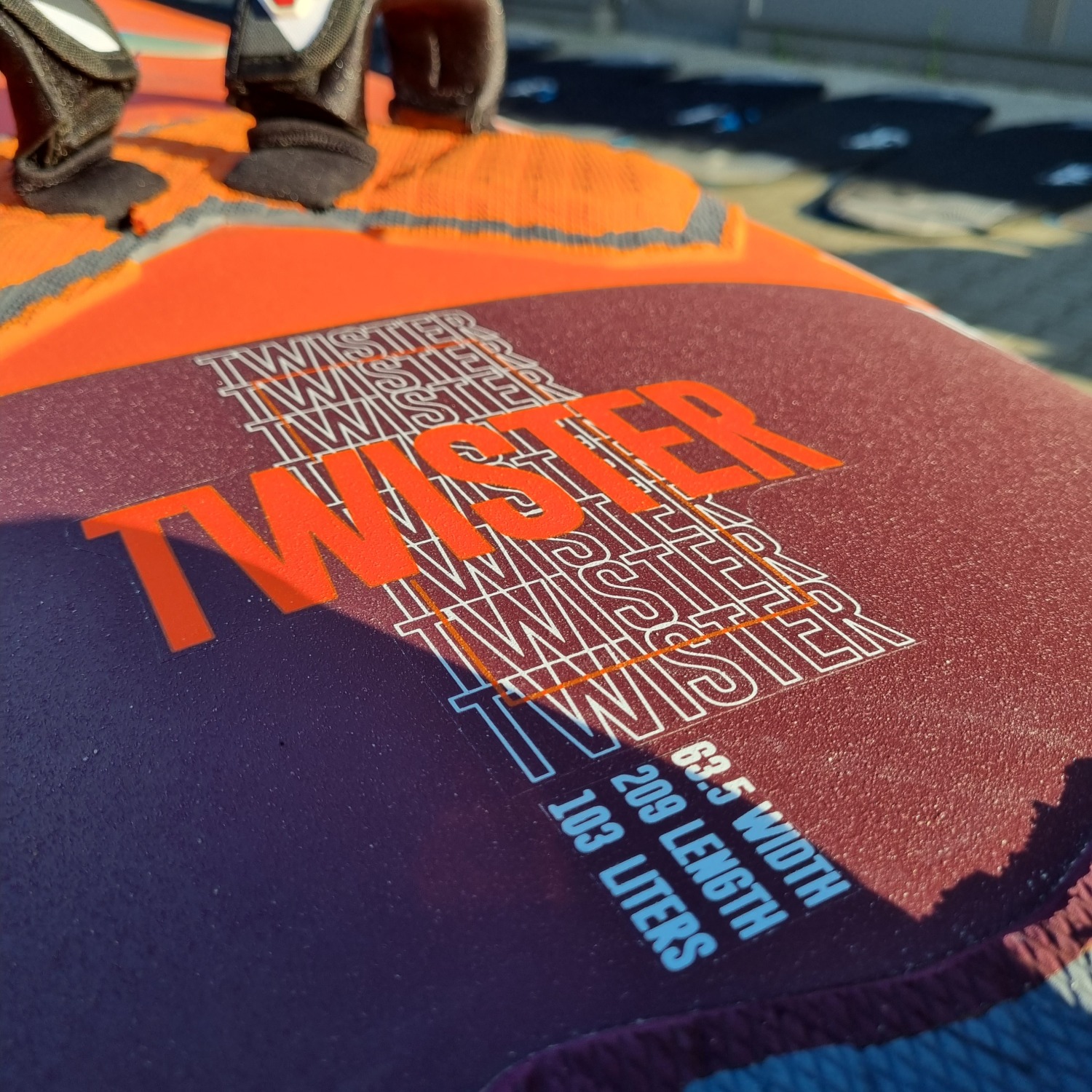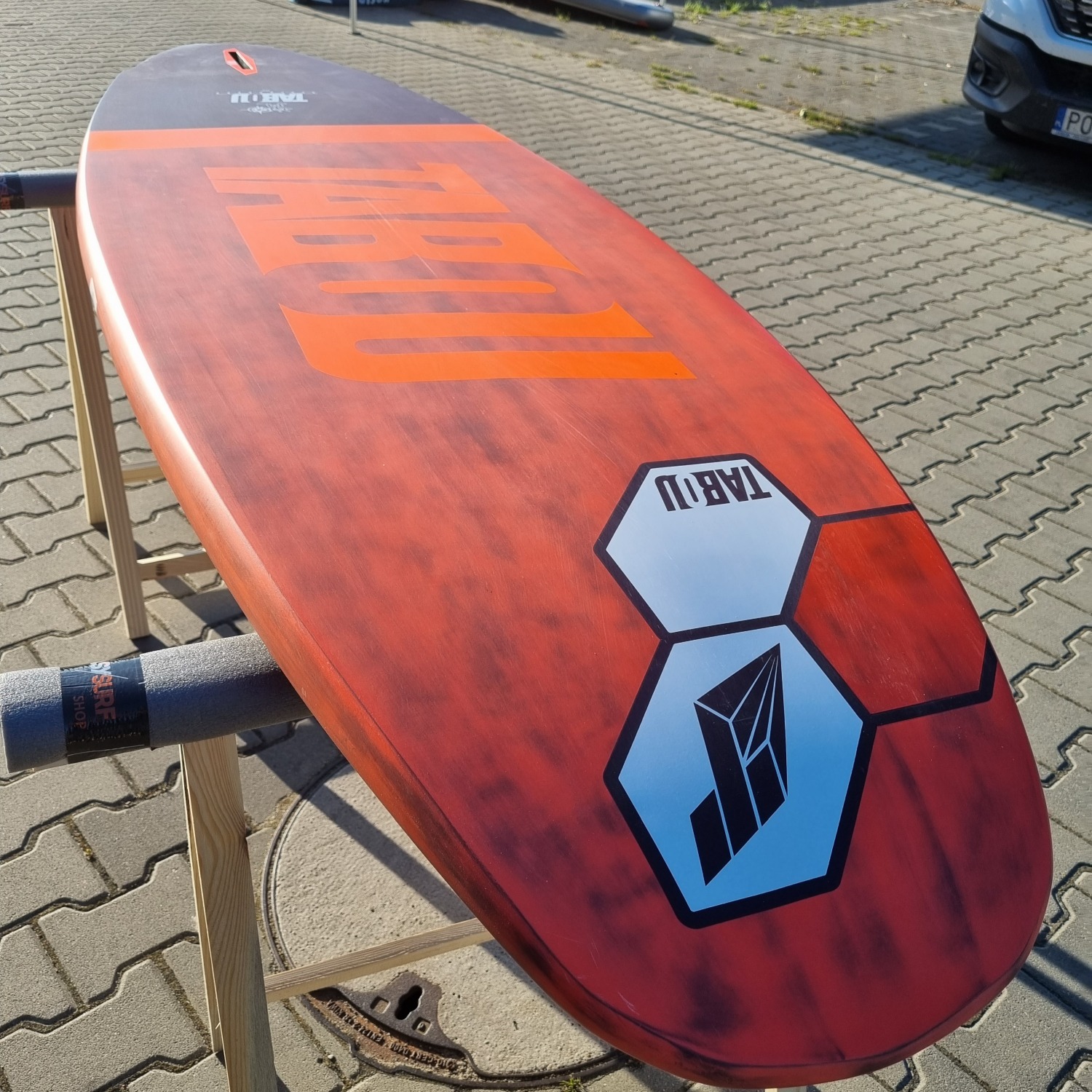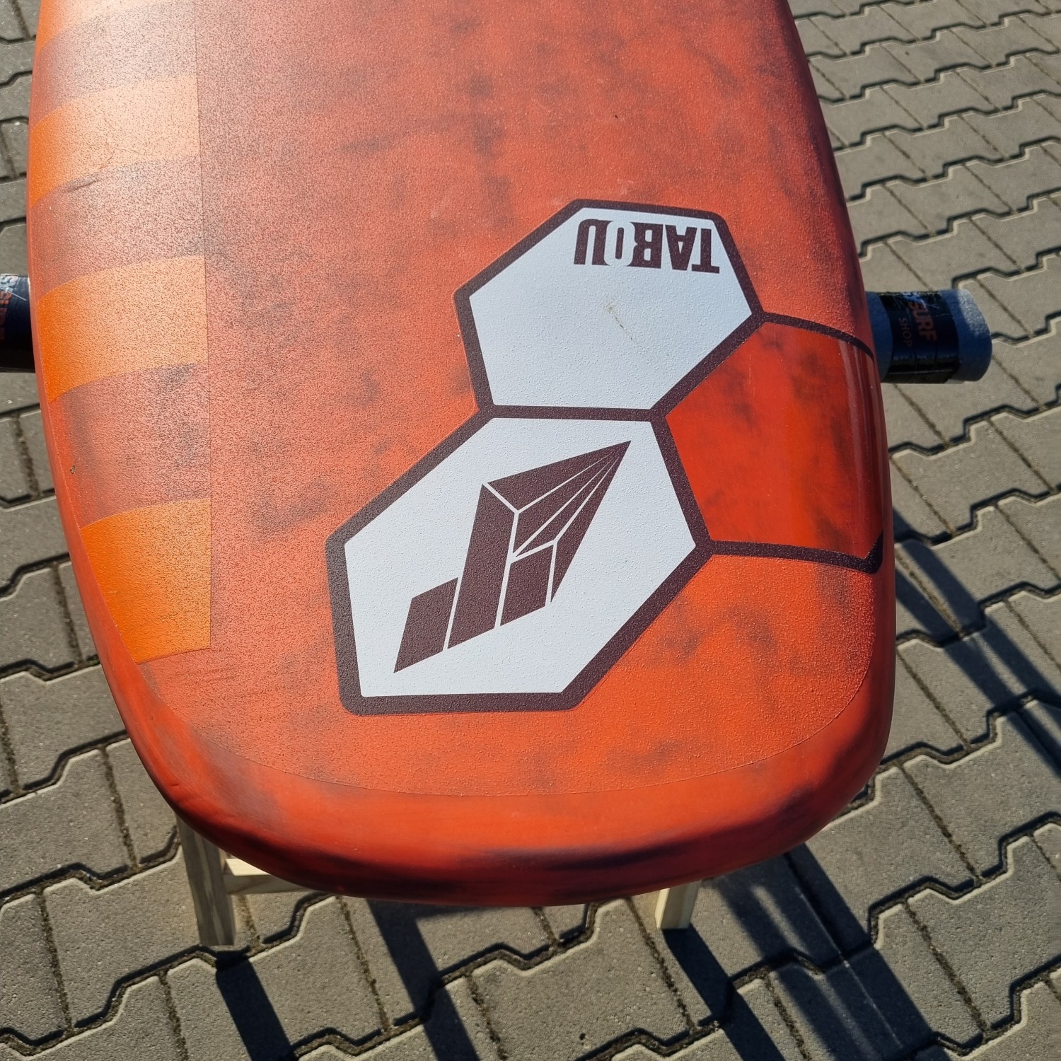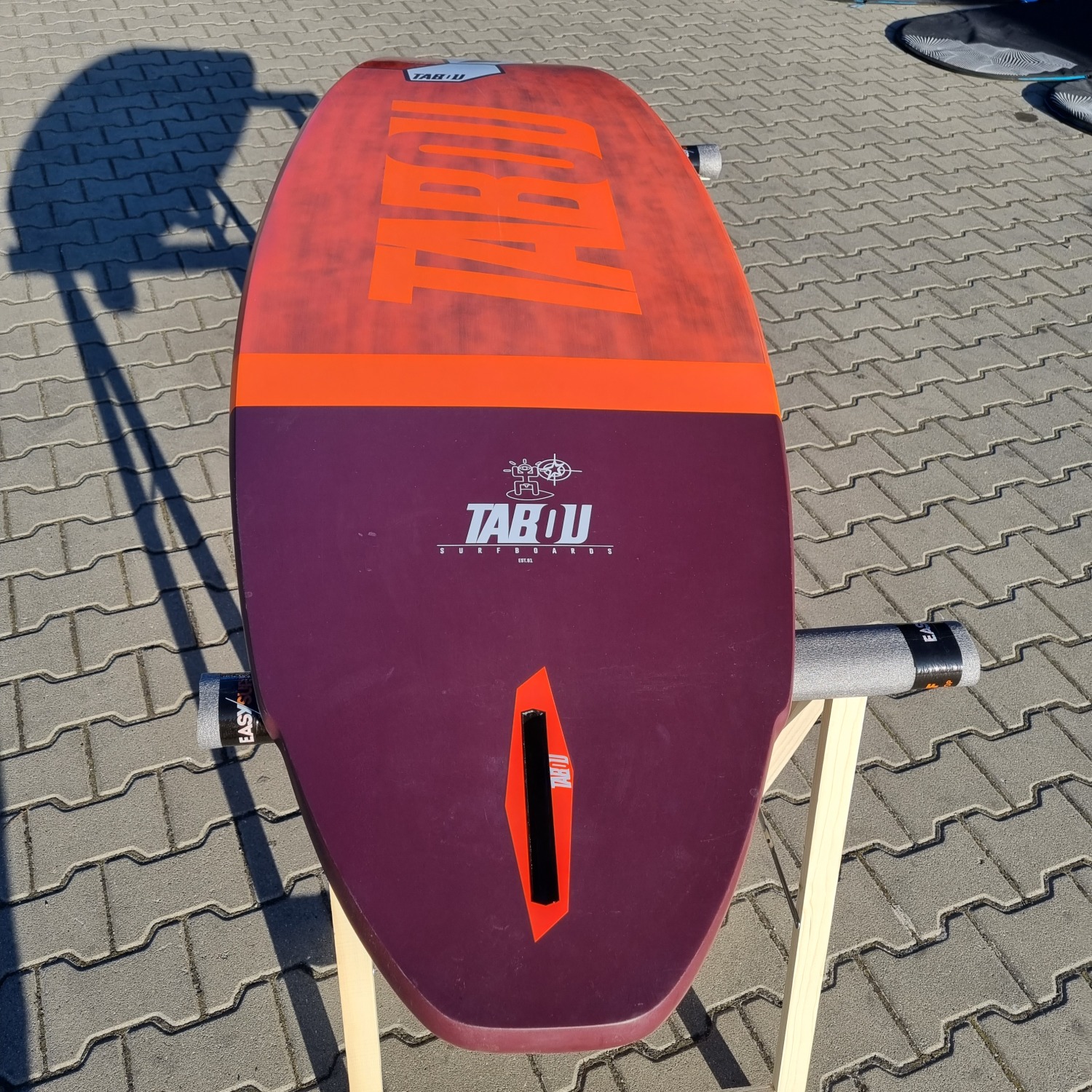 Deska była użytkowana przez riderów EASY-surfshop w sezonie 2022. Była sporadycznie użytkowana na loklanych akwenach, przez co deska jest w niemal idealnym stanie. Jedynym mankamentem jest ślad po lekkim uderzeniu w przedniej części pokładu (ostatnie zdjęcie). Deska wyposażona jest w statecznik i komplet footstrapów.